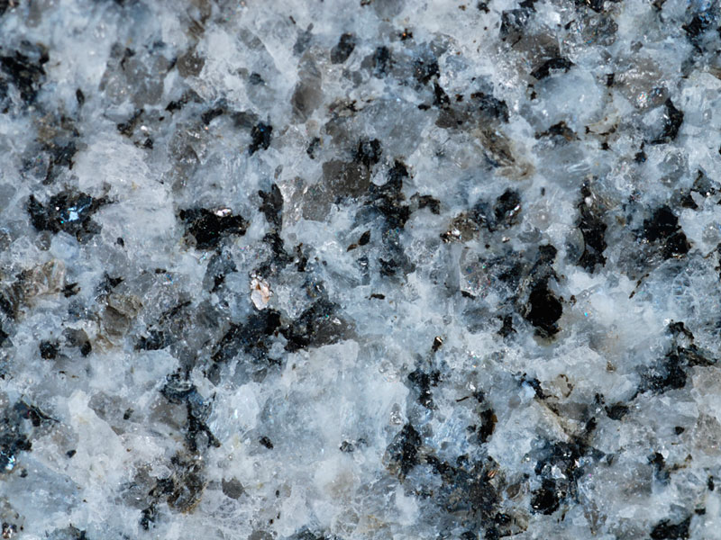In thin section the rock exhibits large plates of quartz, intergrown with altered plagioclase and microcline feldspar. The microcline exhibits characteristic cross-hatched twinning. The rock contains many small fox-brown biotite grains with zircon inclusions, each surrounded by a pleochroic halo. Muscovite is present both as small grains intergrown with biotite and as larger plates.