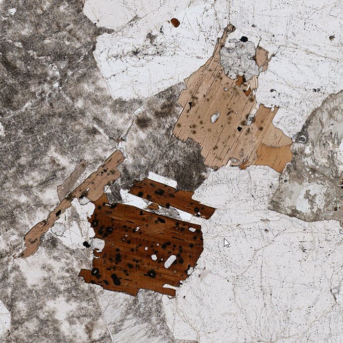 Biotite presents a characteristic change in colour from light brown to dark brown, what geologists call a pleochroism. Usually it can show cleavage (continuous or discontinuous parallel lines) that develops parallel to the tabular appearance of biotite. Biotite is a common rock-forming mineral both in igneous but also metamorphic and sedimentary rocks.