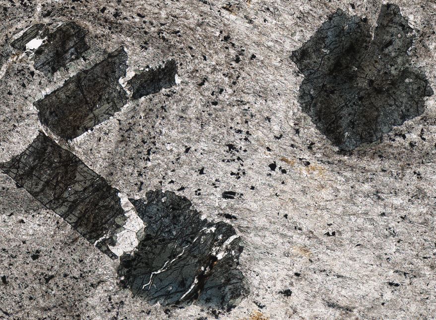 Andalusite is a metamorphic mineral which is found in metamorphic rocks that have experienced a heating episode in relatively shallow conditions (i.e., in the upper crust). Its typical microscopic appearance consists of tabular to rectangular crystals with medium relief ranging from colourless to light greyish. Of the three polymorphs (andalusite, sillimanite, kyanite), andalusite is the easiest to recognize due to a unique microscopical feature it has. The rectangular crystals frequently create an “X” pattern that crosscut each other at the centre of the crystal. This variety of andalusite is named chiastolite, as in the Greek “chiasti, meaning an X pattern”.