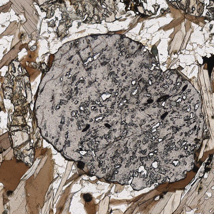 Garnet is a metamorphic mineral that can remain stable in a very broad range of temperatures and pressures. Magmatic garnet (i.e., crystallized from a magma) is not uncommon in igneous rocks rich in aluminium and iron. Garnet contains several endmembers based on their mineral chemistry, but the most common species are: pyrope (Mg-Al garnet), almandine (Fe-Al garnet), spessartine (Mn-Al garnet) and grossular (Ca-Al garnet). Garnet usually occurs as rounded, large grains (porphyroblasts) with high relief. Garnet belongs to the cubic crystallographic system, hence, under crossed polars shows constant extinction (i.e., opaque). Garnet is one of the most studied minerals in the world; due to its various occurrence and large stability field, it is a powerful tool for petrologists which they use very frequently in their studies. Specifically, using certain thermodynamic modelling programs they can even describe the most complex origin stories of metamorphic rocks.
